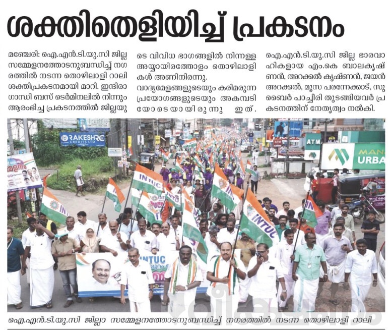 ഐ.എന്.റ്റി.യു.സി. സംസ്ഥാന റാലിക്കും സമ്മേളനത്തിനും മുന്നോടിയായി നടത്തപ്പെടുന്ന ജില്ലാ റാലികളും സമ്മേളനങ്ങളും ആരംഭിച്ചു. നവംബര് 11 മുതല് ഡിസംബര് 11 വരെയാണ് ജില്ലാ റാലികളും സമ്മേളനങ്ങളും നടക്കുന്നത്. ആദ്യറാലി മലപ്പുറത്ത് മഞ്ചേരിയില് നവംബര് 11 ന് മുന്മന്ത്രി എ.പി. അനില്കുമാര് ഉത്ഘാടനം ചെയ്തു. ഐ.എന്.റ്റി.യു.സി. സംസ്ഥാന പ്രസിഡന്റ് മുഖ്യപ്രഭാഷണം നടത്തി. ഐ.എന്.റ്റി.യു.സി. ജില്ലാ പ്രസിഡന്റ് വി.പി. ഫിറോസിന്റെ നേതൃത്വത്തില് ആയിരക്കണക്കിന് തൊഴിലാളികള് പങ്കെടുത്ത റാലി മഞ്ചേരി പട്ടണത്തിന് പുതിയൊരു അനുഭവവും തൊഴിലാളികള്ക്ക് ആവേശവും ആയി മാറി.