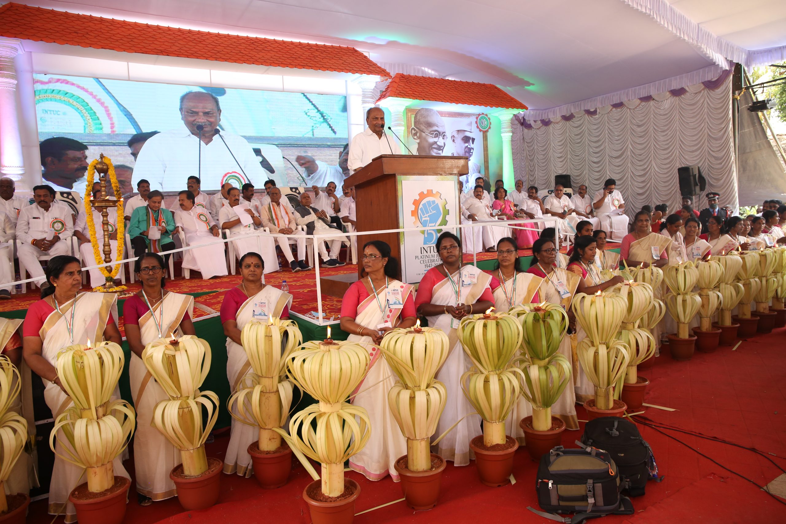 ഐ.എന്.റ്റി.യു.സി. രൂപീകരണത്തിന്റെ 75 വര്ഷം അടയാളപ്പെടുത്തി 75 വനിതാ തൊഴിലാളി നേതാക്കള് കൊളുത്തിയ 75 ദീപങ്ങള് ചടങ്ങിന് കൂടുതല് ശോഭയേകി.
